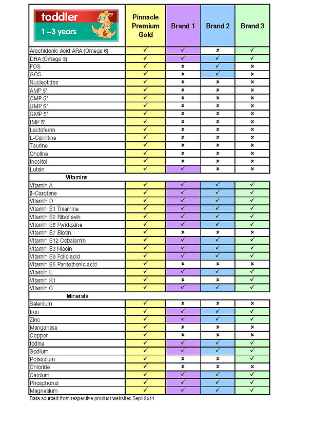 Refer to the tables below to compare Pinnacle Premium Gold against four major infant formula brands.